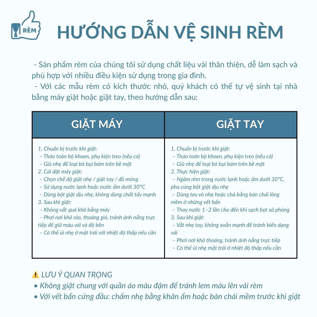 • Chiều cao rèm cũng có thể linh hoạt: Nếu chiều cao cửa thấp hơn kích thước rèm, khách có thể điều chỉnh điểm treo hoặc để vải phủ nhẹ xuống dưới – vẫn đảm bảo đẹp và dễ lắp.