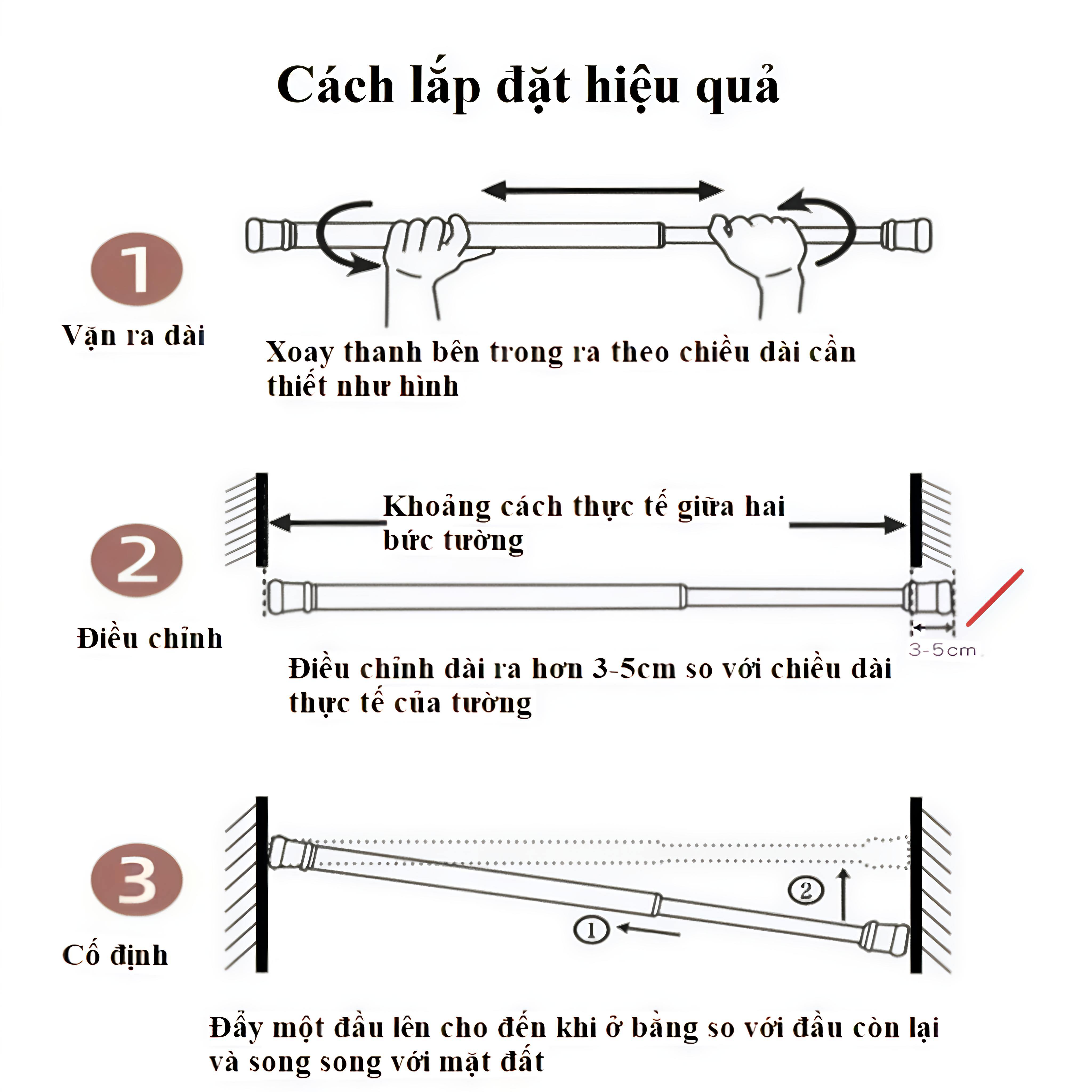 • Cần đo chính xác khoảng cách 2 mép tường để chọn thanh phù hợp độ giãn